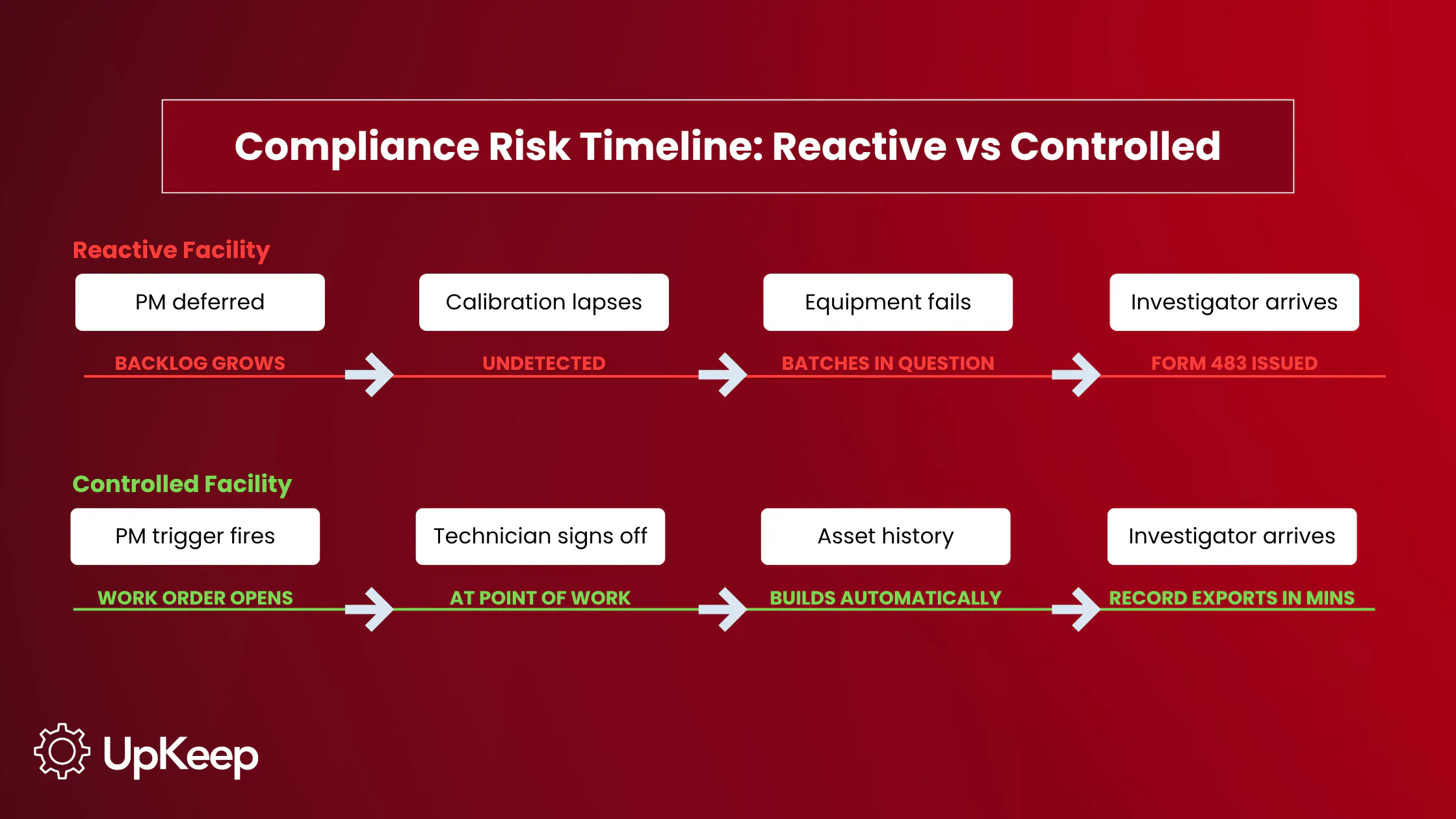 UpKeep makes that the default. Work orders open automatically from PM triggers, and technicians sign off on mobile at the point of work, so the timestamp is the system's, not whoever completes the paperwork. Asset history is exportable in minutes, meaning an investigator who arrives unannounced receives the same record as one who schedules a visit three weeks out.