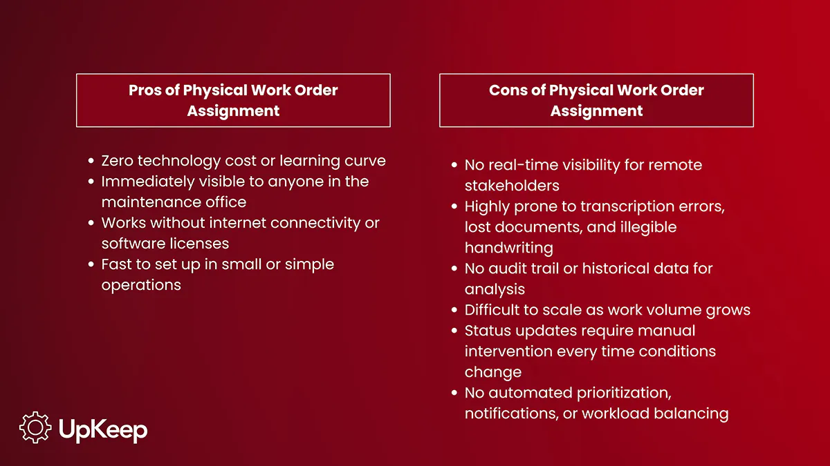 Broadly, work order assignment methods fall into two categories: physical and digital. Understanding the strengths and weaknesses of each helps you make the right choice for your operation's size, complexity, and growth trajectory.