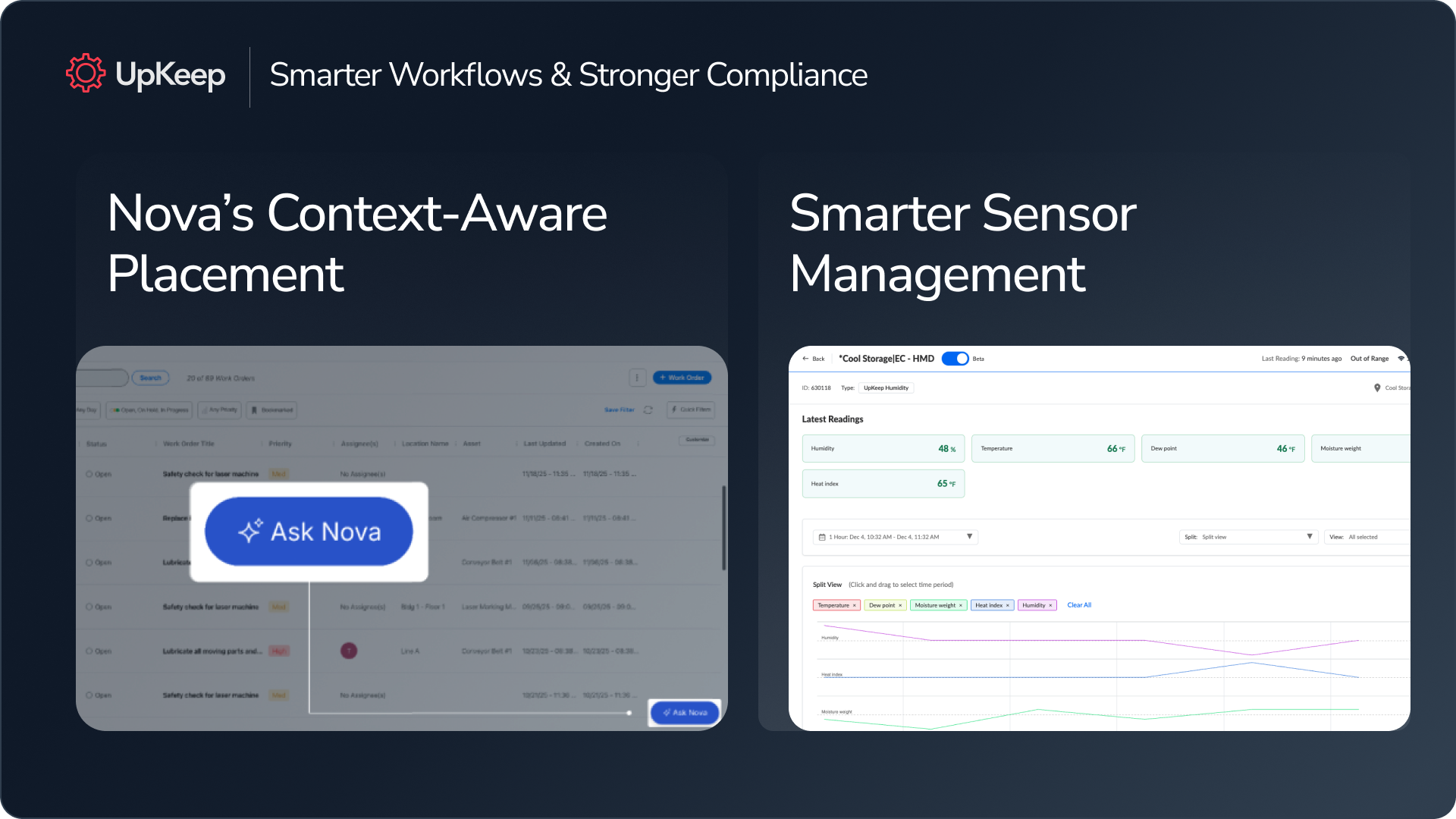 New locked tasks ensure accountability, providers gain centralized work order views, Nova integrates as a sidebar, Edge sensors get smarter filtering, and EHS documentation converts to checklists instantly.